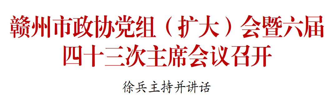 12月16日,赣州市政协党组(扩大)会暨六届四十三次主席会议召开,集中学习习近平总书记近期重要讲话、重要指示批示和重要文章精神,传达学习全市领导干部会议、市委常委会(扩大)会议、省委整治形式主义为基层减负专项工作机制办公室和市纪委监委有关通报以及革命老区重点城市政协联动协商联系会议精神,审议《关于召开政协赣州市第六届委员会第五次会议的决定》,听取市政协六届四次会议以来提案办理情况汇报、2024年度市政协委员履职情况汇报、市政协办公室和各专委会2024年度工作情况汇报。市政协主席、党组书记徐兵主持会议并讲话。