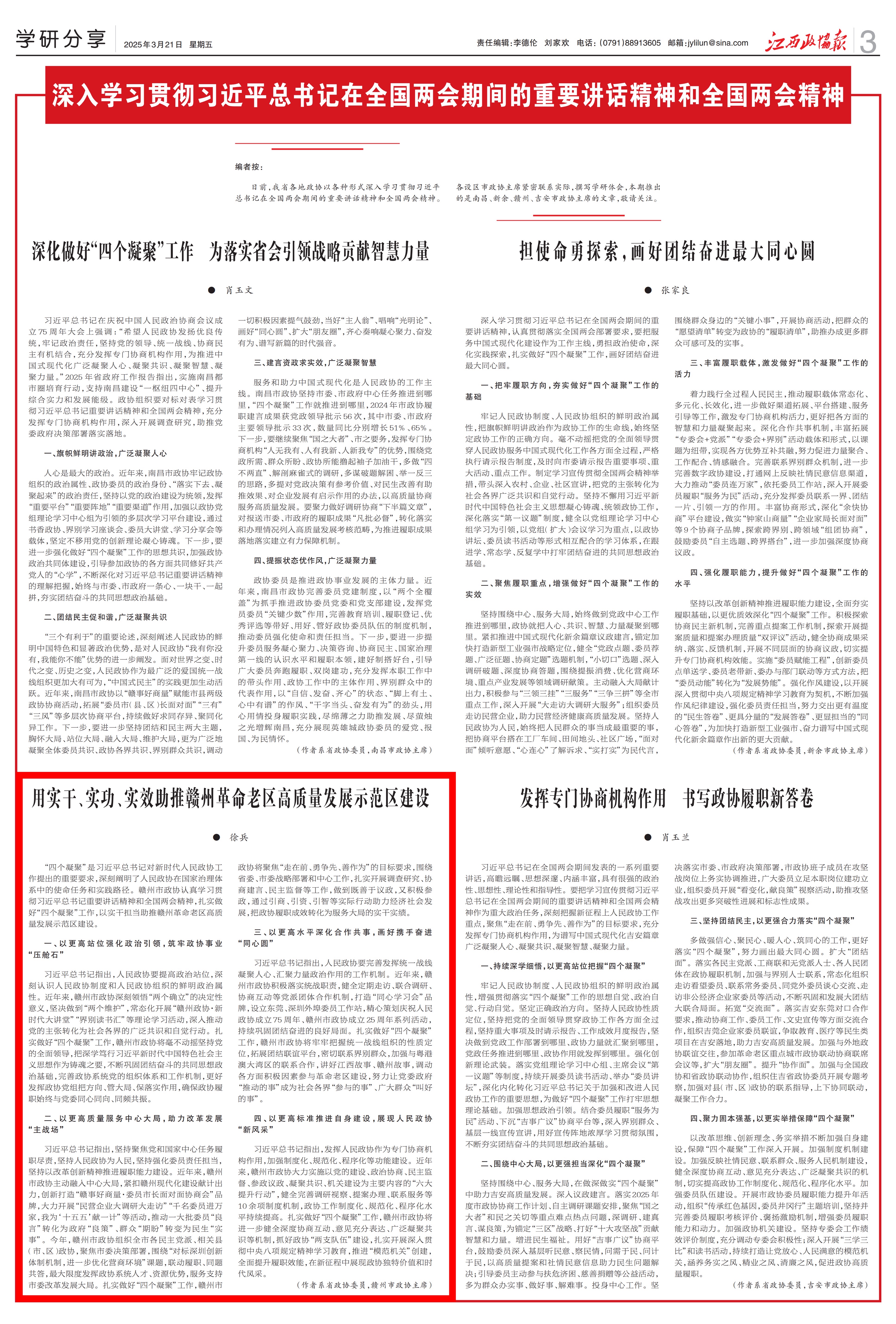 “四个凝聚”是习近平总书记对新时代人民政协工作提出的重要要求,深刻阐明了人民政协在国家治理体系中的使命任务和实践路径。赣州市政协认真学习贯彻习近平总书记重要讲话精神和全国两会精神,扎实做好“四个凝聚”工作,以实干担当助推赣州革命老区高质量发展示范区建设。