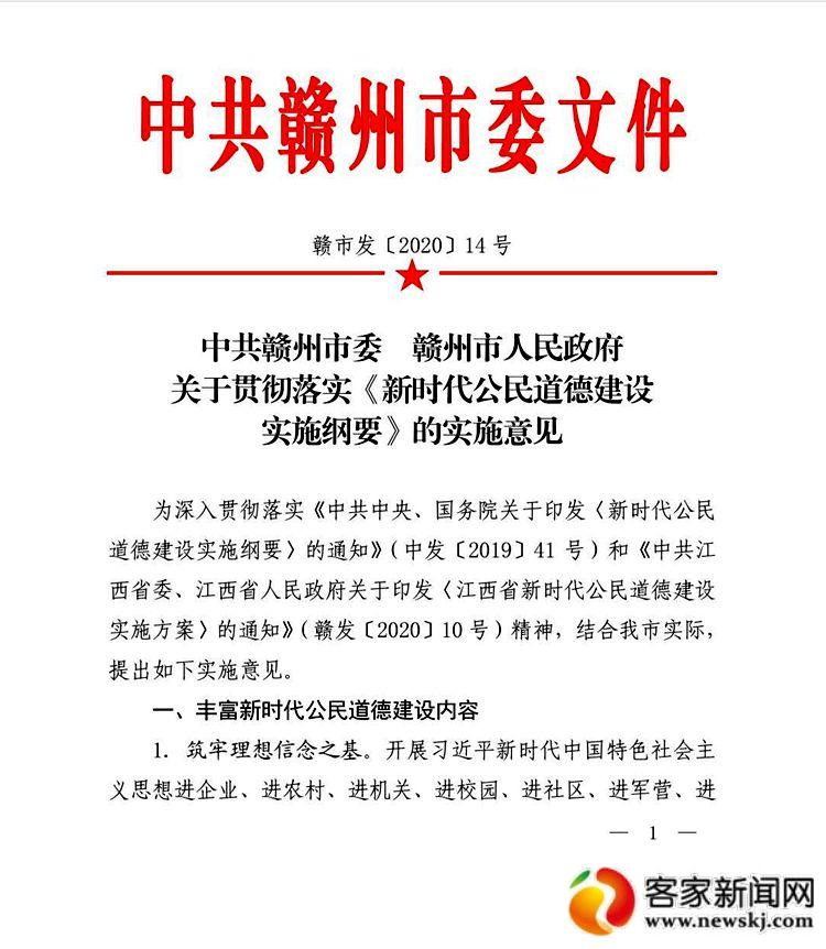 客家新闻网讯见习记者方强报道:近日,赣州市委市政府印发《关于贯彻落实〈新时代公民道德建设实施纲要〉的实施意见》,并发出通知,要求各地各部门结合实际抓好贯彻落实。